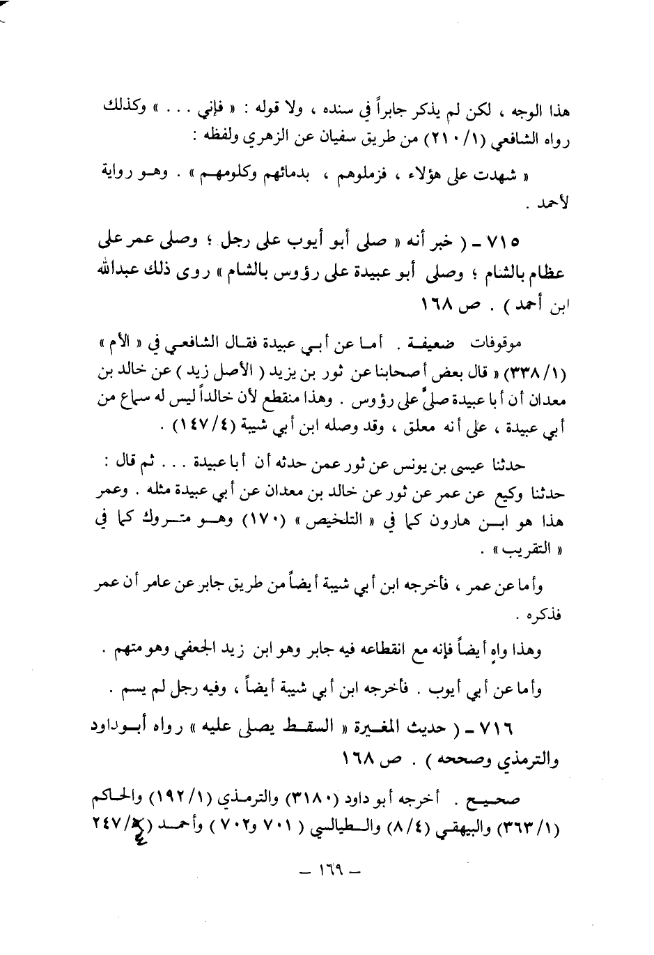 (715) - (خبر أنه: " صلى أبو أيوب على رجل , وصلى عمر على عظام بالشام , وصلى أبو عبيدة على رؤوس بالشام " روى ذلك عبد الله بن أحمد (ص 168)