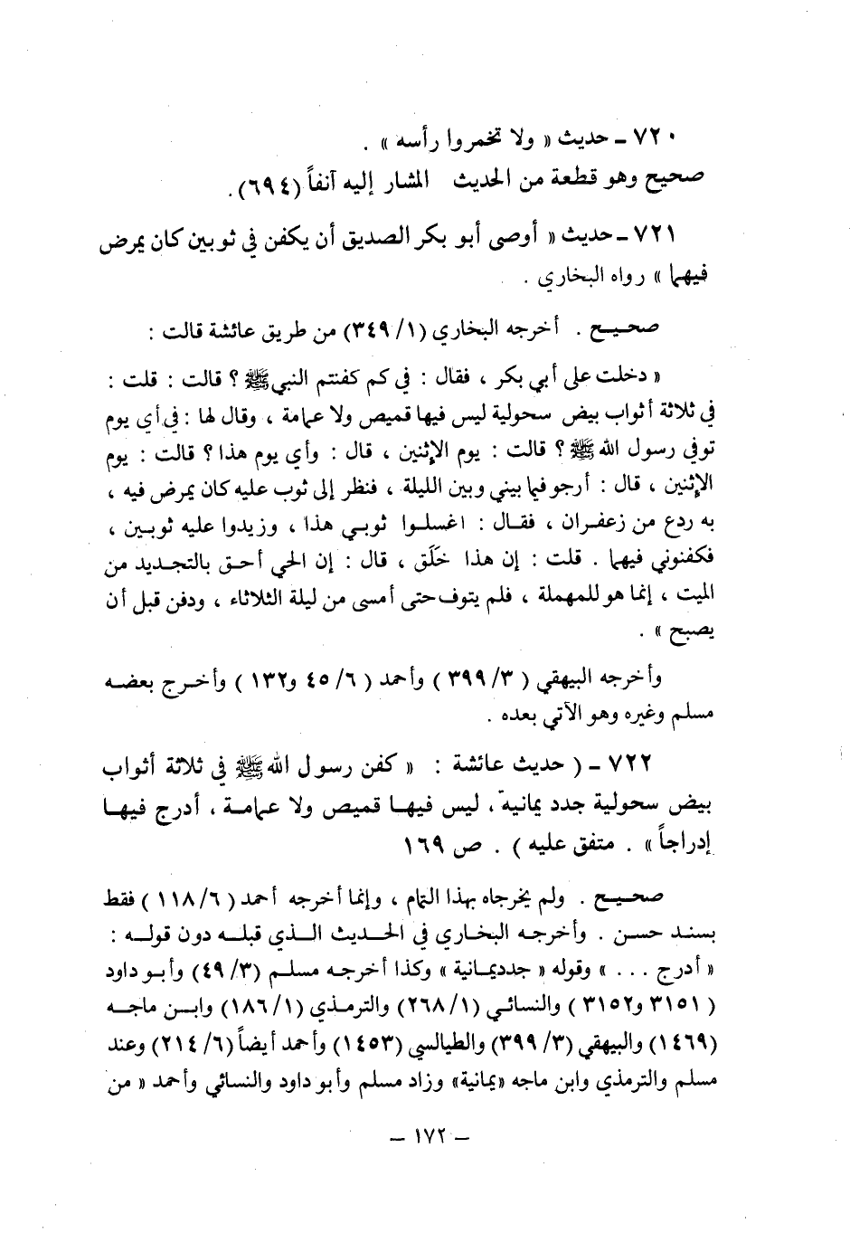 (722) - (حديث عائشة: " كفن رسول الله صلى الله عليه وسلم فى ثلاثة أثواب بيض سحولية جدد يمانية , ليس فيها قميص ولا عمامة , أدرج فيها إدراجا " متفق عليه (ص 169) .