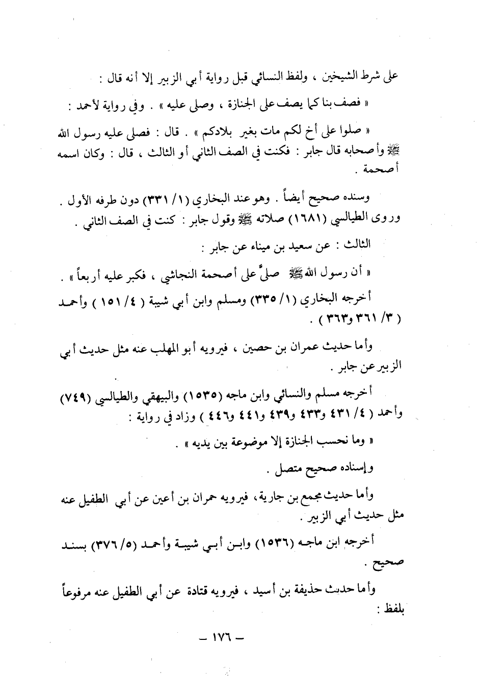 وأما حديث عمران بن حصين , فيرويه أبو المهلب عنه مثل حديث أبى الزبير عن جابر أخرجه مسلم والنسائى وابن ماجه (1535) والبيهقى والطيالسى (749) وأحمد (4/431 و433 و439 و441 و446) وزاد فى رواية: " وما نحسب الجنازة إلا موضوعة بين يديه " , وإسناده صحيح متصل.