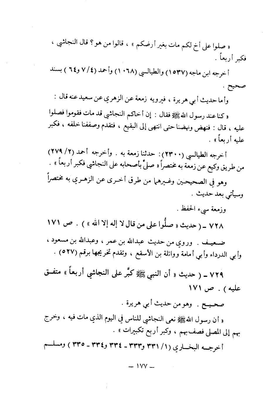 (729) - (حديث: " أن النبى صلى الله عليه وسلم كبر على النجاشى أربعا " متفق عليه (ص 171) .