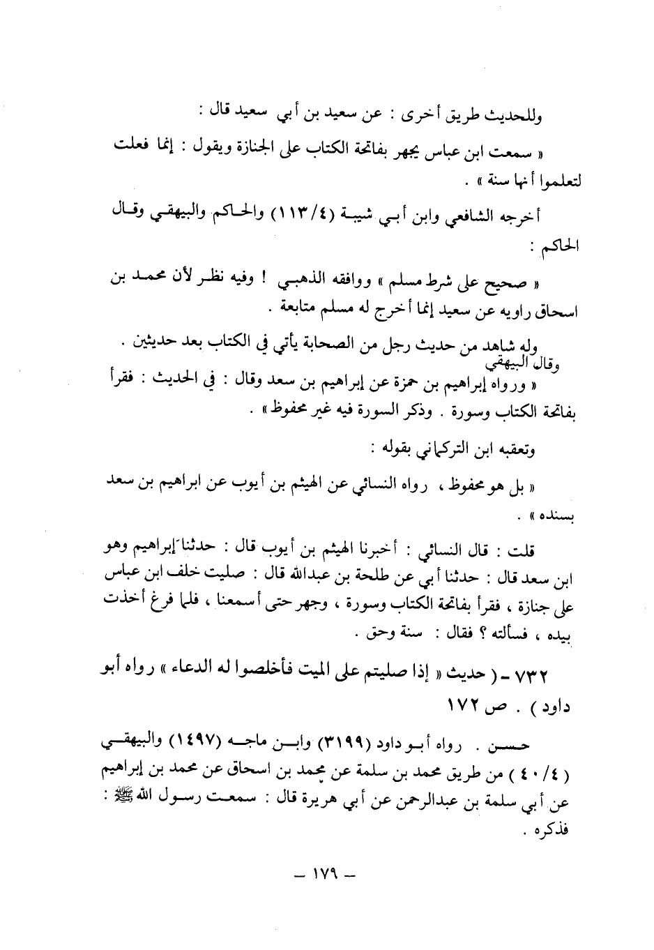 قلت: قال النسائى: أخبرنا الهيثم بن أيوب قال: حدثنا إبراهيم وهو ابن سعد قال: حدثنا أبى عن طلحة بن عبد الله قال: صليت خلف ابن عباس على جنازة , فقرأ بفاتحة الكتاب وسورة , وجهر حتى أسمعنا , فلما فرغ أخذت بيده , فسألته؟ فقال: سنة وحق.