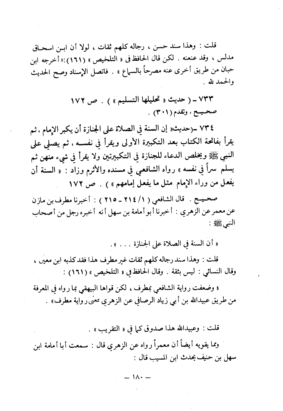 (734) - (حديث: " إن السنة فى الصلاة على الجنازة أن يكبر الإمام , ثم يقرأ بفاتحة الكتاب بعد التكبيرة الأولى ويقرأ فى نفسه , ثم يصلى على النبى صلى الله عليه وسلم ويخلص الدعاء للجنازة فى التكبيرتين ولا يقرأ فى شىء منهن ثم يسلم سرا فى نفسه رواه الشافعى فى مسنده , والأثرم وزاد: " السنة أن يفعل من وراء الإمام مثل ما يفعل إمامهم " (ص 172) .