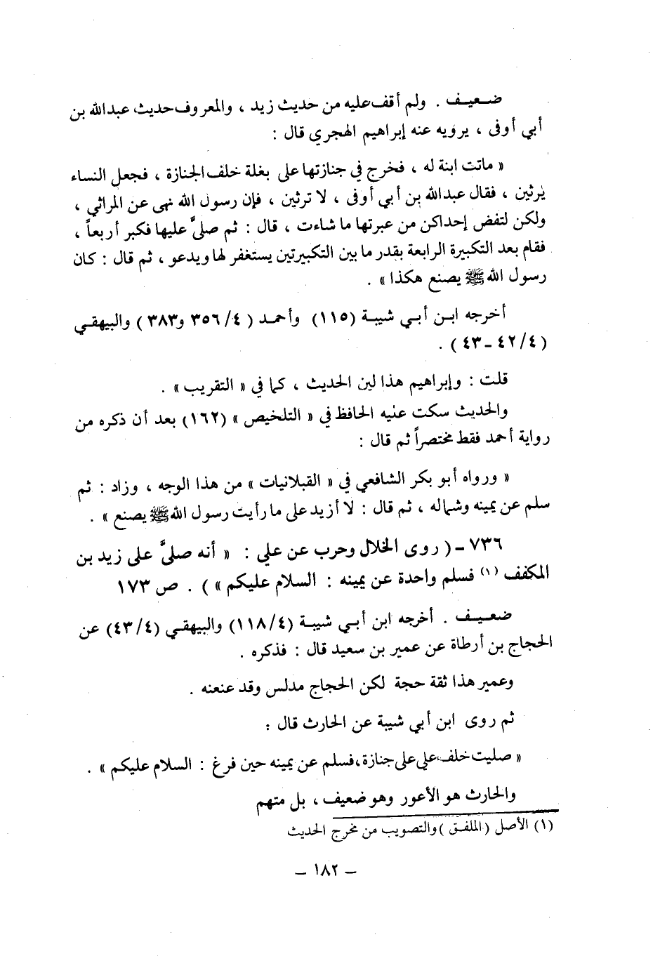 (736) - (روى الخلال , وحرب عن على: " أنه صلى على زيد بن المكفف (1) فسلم واحدة عن يمينه: السلام عليكم " (ص 173) .