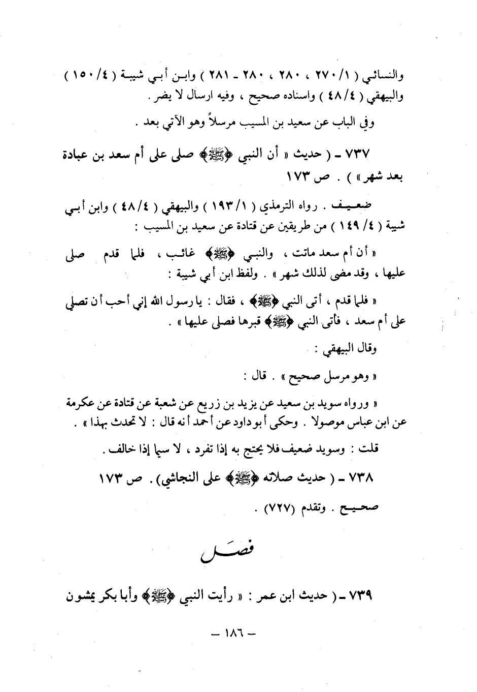 (737) - (حديث: " أن النبى صلى الله عليه وسلم صلى على أم سعد بن عبادة بعد شهر " (ص 173) .