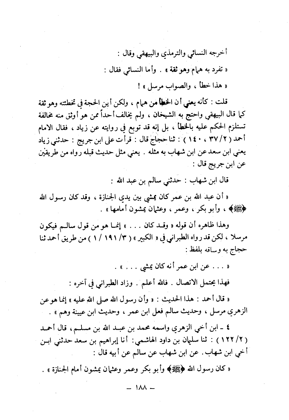 قلت: كأنه يعنى أن الخطأ من همام , ولكن أين الحجة فى تخطئته وهو ثقة كما قال البيهقى واحتج به الشيخان , ولم يخالف أحدا ممن هو أوثق منه مخالفة تستلزم الحكم عليه بالخطأ , بل إنه قد توبع فى روايته عن زياد , فقال الإمام أحمد (2/37 , 140) : حدثنا حجاج قال: قرأت على ابن جريج: حدثنى زياد يعنى ابن سعد عن ابن شهاب به مثله. يعنى مثل حديث قبله رواه من طريقين عن ابن