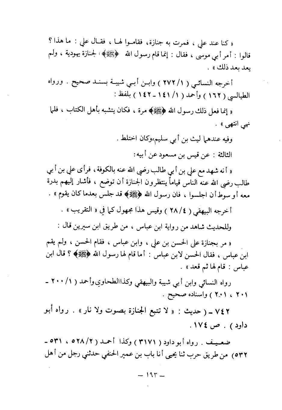 " كنا عند على فمرت به جنازة , فقاموا لها , فقال على: ما هذا؟ قالوا: أمر أبى موسى , فقال: إنما قام رسول الله صلى الله عليه وسلم لجنازة يهودية , ولم يعد بعد ذلك "