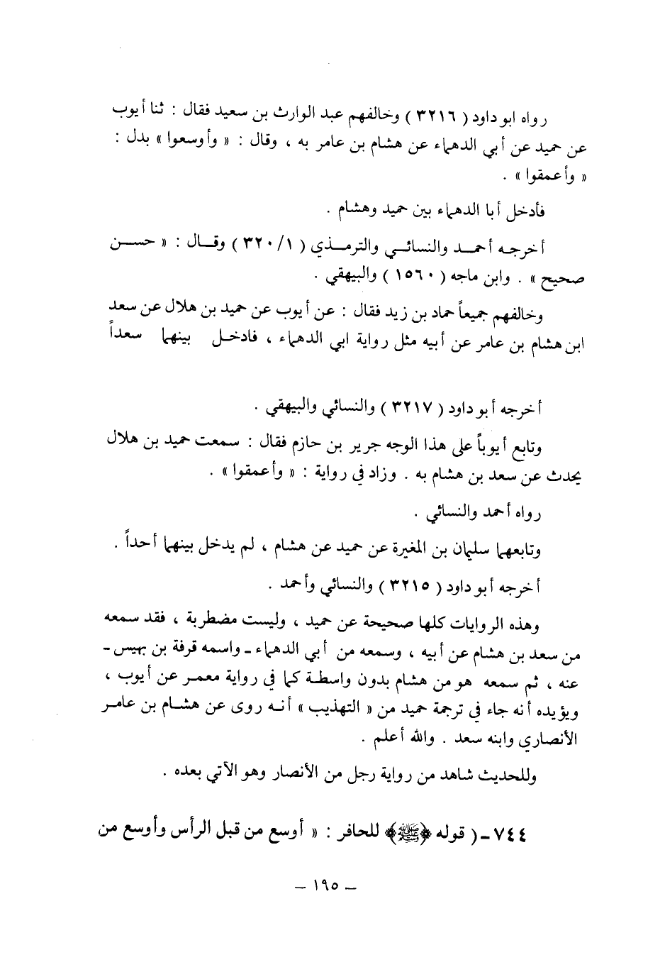 وهذه الروايات كلها صحيحه عن حميد , وليست مضطربة , فقد سمعه من سعد بن هشام عن أبيه , وسمعه من أبى الدهماء ـ واسمه قرفة بن بهيس ـ عنه , ثم سمعه هو من هشام بدون واسطة كما فى رواية معمر عن أيوب , ويؤيده أنه جاء فى ترجمة حميد من " التهذيب " أنه روى عن هشام بن عامر الأنصارى وابنه سعد , والله أعلم.