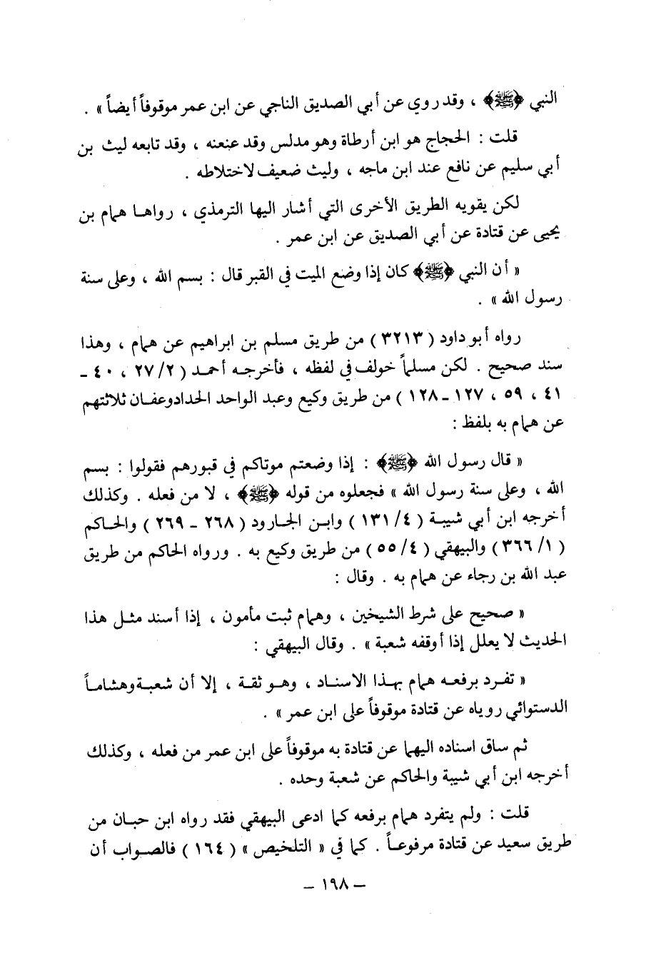 لكن يقويه الطريق الأخرى التى أشار إليها الترمذى , رواها همام بن يحيى عن قتادة عن أبى الصديق عن ابن عمر " أن النبى صلى الله عليه وسلم كان إذا وضع الميت فى القبر قال: بسم الله , وعلى سنة رسول الله ".