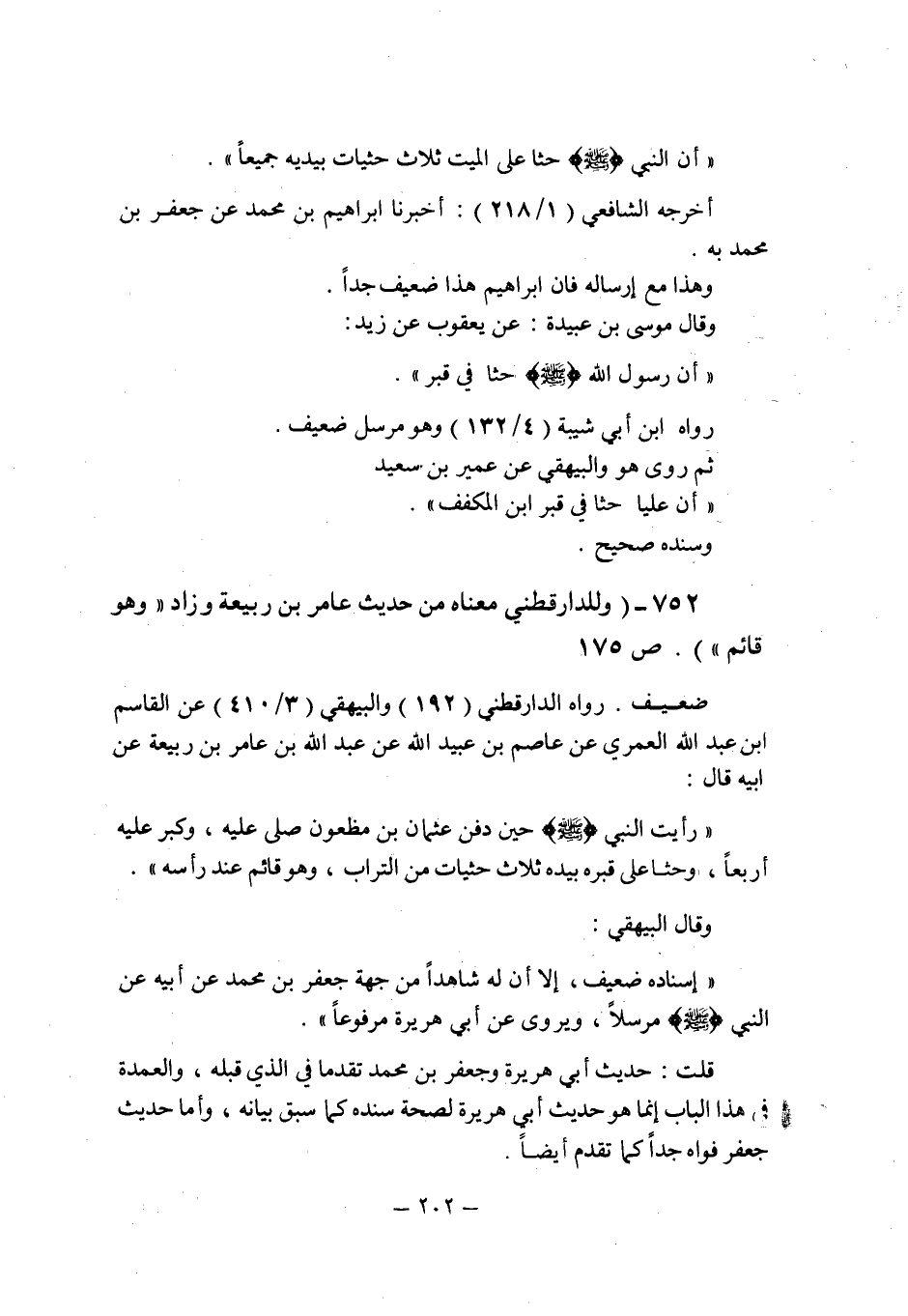 ثم روى هو والبيهقى عن عمير بن سعيد " أن عليا حثا فى قبر ابن المكفف ".