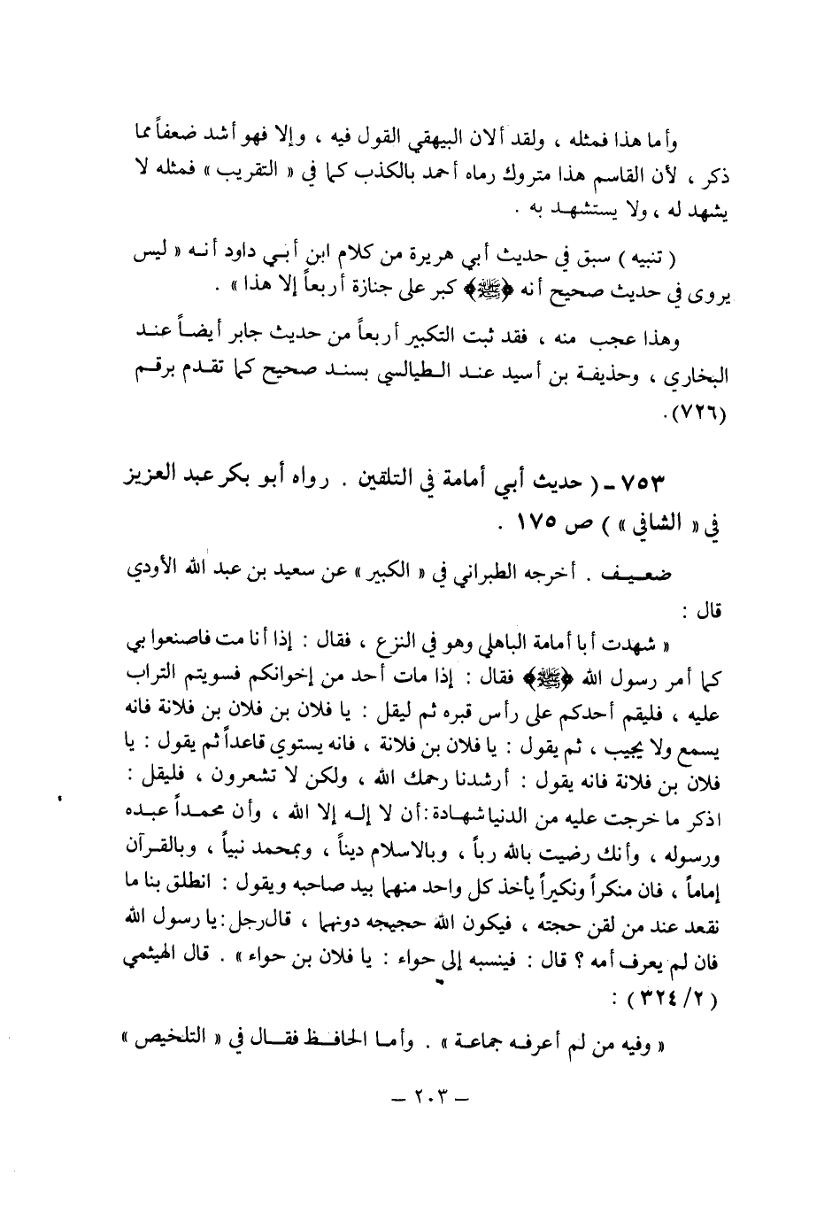 (753) - (حديث: " أبى أمامة فى التلقين ". رواه أبو بكر عبد العزيز فى " الشافى " (ص 175) .