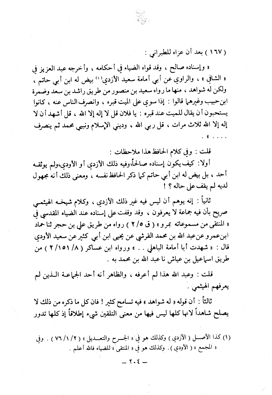 (167) بعد أن عزاه للطبرانى: " وإسناده صالح , وقد قواه الضياء فى أحكامه , وأخرجه عبد العزيز فى " الشافى " , والراوى عن أبى أمامة سعيد الأزدى (1) بيض له ابن أبى حاتم , ولكن له شواهد , منها ما رواه سعيد بن