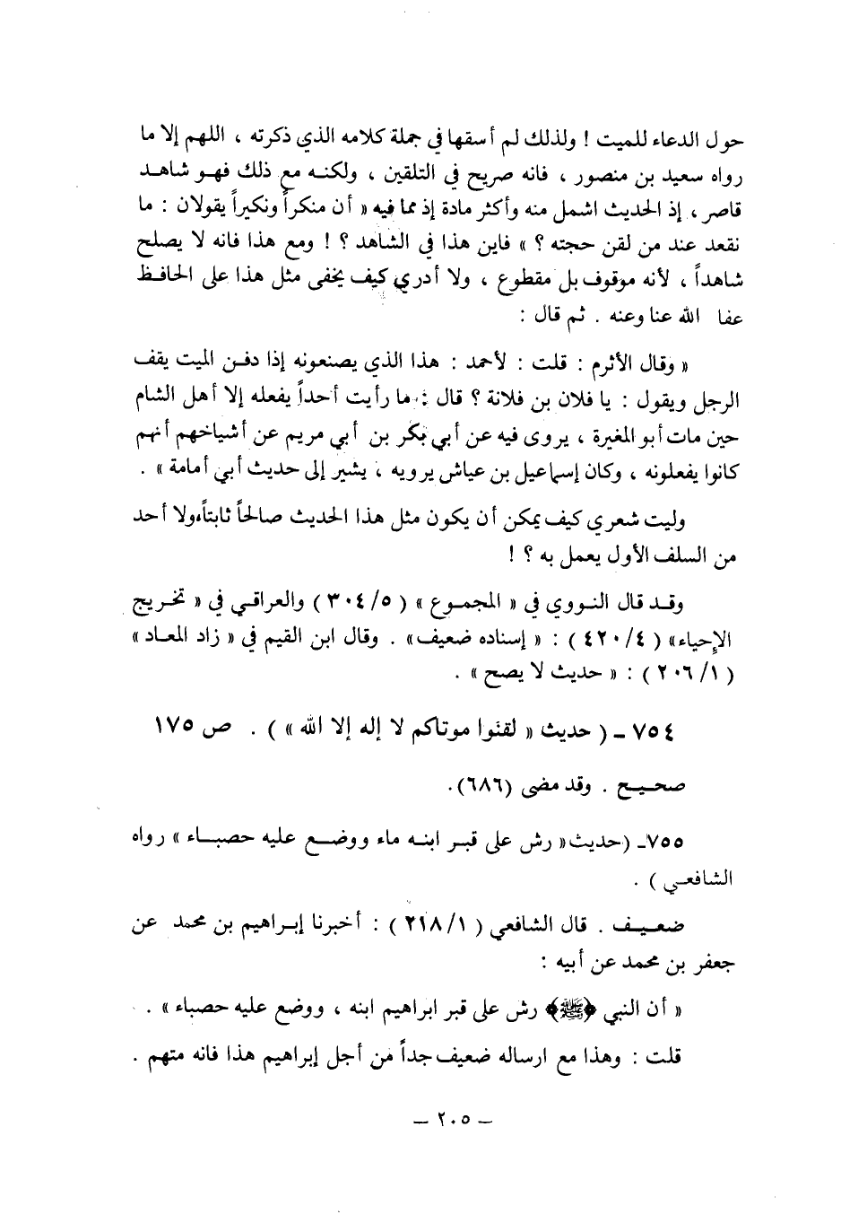 حول الدعاء للميت! ولذلك لم أسقها فى جملة كلامه الذى ذكرته , اللهم إلا ما رواه سعيد بن منصور , فإنه صريح فى التلقين , ولكنه مع ذلك فهو شاهد قاصر , إذ الحديث أشمل منه وأكثر مادة إذ مما فيه " أن منكرا ونكيرا يقولان: ما نقعد عند من لقن حجته؟ " فأين هذا فى الشاهد؟ ! ومع هذا فإنه لا يصلح شاهدا , لأنه موقوف بل مقطوع , ولا أدرى كيف يخفى مثل هذا على الحافظ عفا الله عنا وعنه.