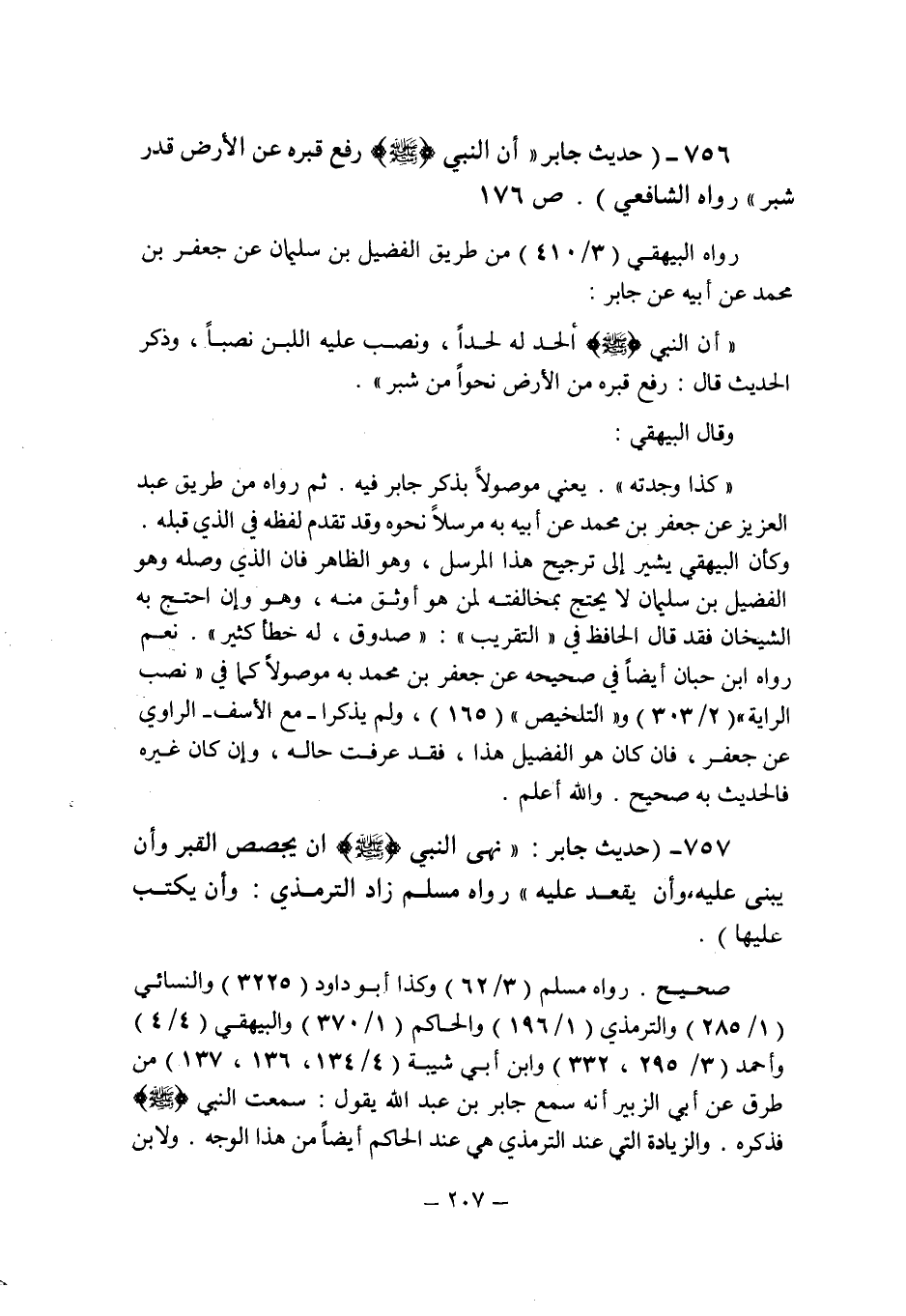 (756) - (حديث جابر: " أن النبى صلى الله عليه وسلم رفع قبره عن الأرض قدر شبر ". رواه الشافعى (ص 176) .
