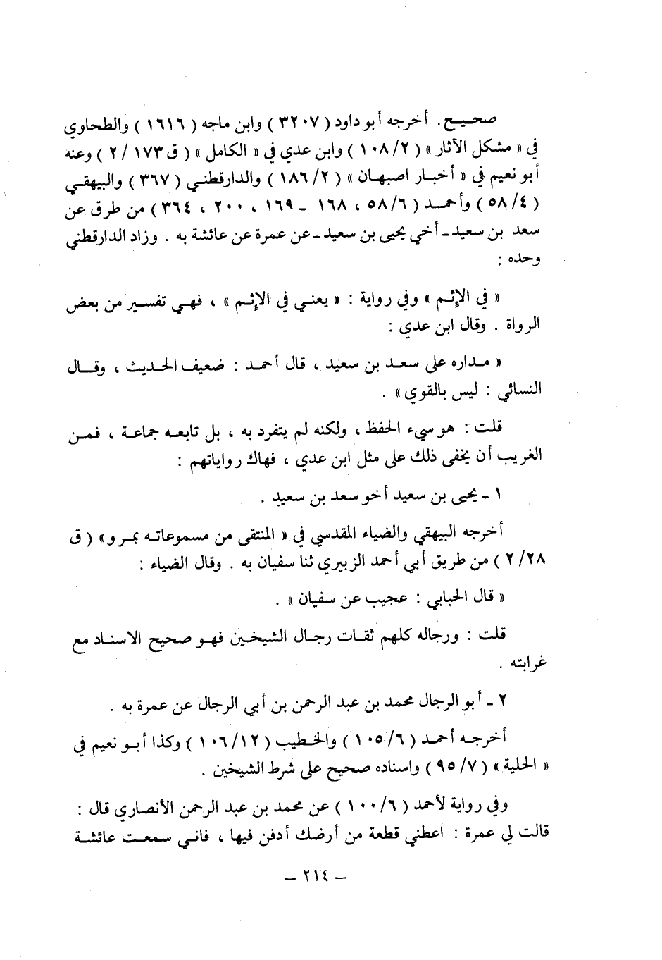 أخرجه أبو داود (3207) وابن ماجه (1616) والطحاوى فى " مشكل الآثار " (2/108) وابن عدى فى " الكامل " (ق 173/2) وعنه أبو نعيم فى " أخبار أصبهان " (2/186) والدارقطنى (367) والبيهقى (4/58) وأحمد (6/58 , 168 ـ 169 , 200 , 364) من طرق عن سعد بن سعيد ـ أخى يحيى بن سعيد ـ عن عمرة عن عائشة به.