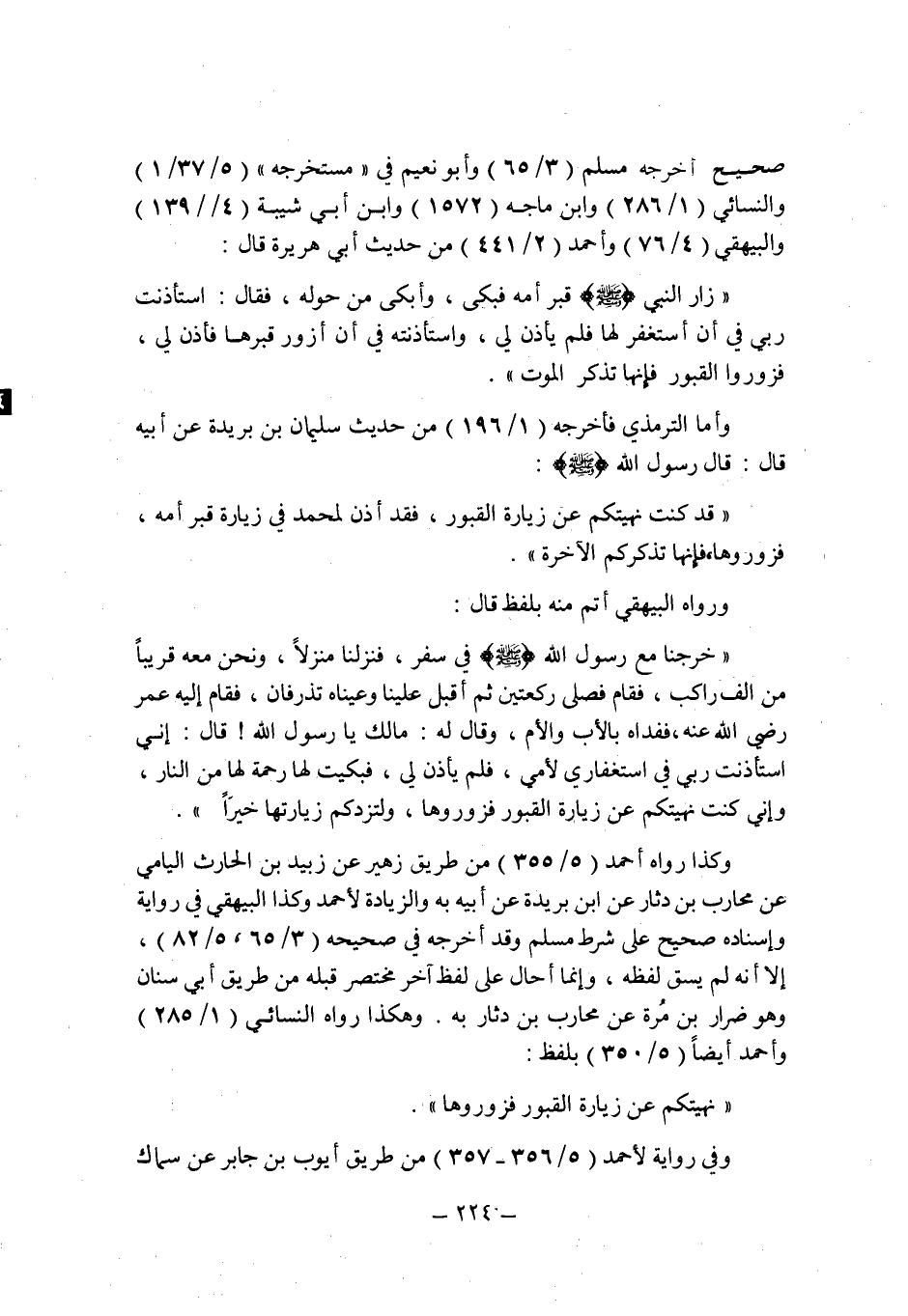 أخرجه مسلم (3/65) وأبو نعيم فى " مستخرجه " (5/37/1) والنسائى (1/286) وابن ماجه (1572) وابن أبى شيبة (4/139) والبيهقى (4/76) وأحمد (2/441) من حديث أبى هريرة قال: " زار النبى صلى الله عليه وسلم قبر أمه فبكى , وأبكى من حوله , فقال: استأذنت ربى فى أن أستغفر لها فلم يأذن لى , واستأذنته فى أن أزور قبرها فأذن لى , فزوروا القبور فإنها تذكر الموت ".