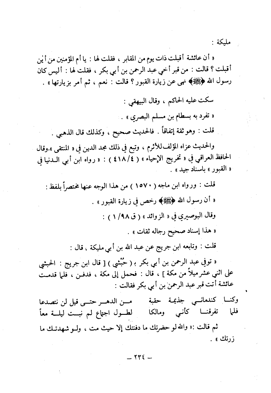 مليكة: " أن عائشة أقبلت ذات يوم من المقابر , فقلت لها: يا أم المؤمين من أين أقبلت؟ قالت: من قبر أخى عبد الرحمن بن أبى بكر , فقلت لها: أليس كان رسول الله صلى الله عليه وسلم نهى عن زيارة القبور؟ قالت: نعم , ثم أمر بزيارتها " سكت عليه الحاكم , وقال البيهقى: " تفرد به بسطام بن مسلم البصرى".