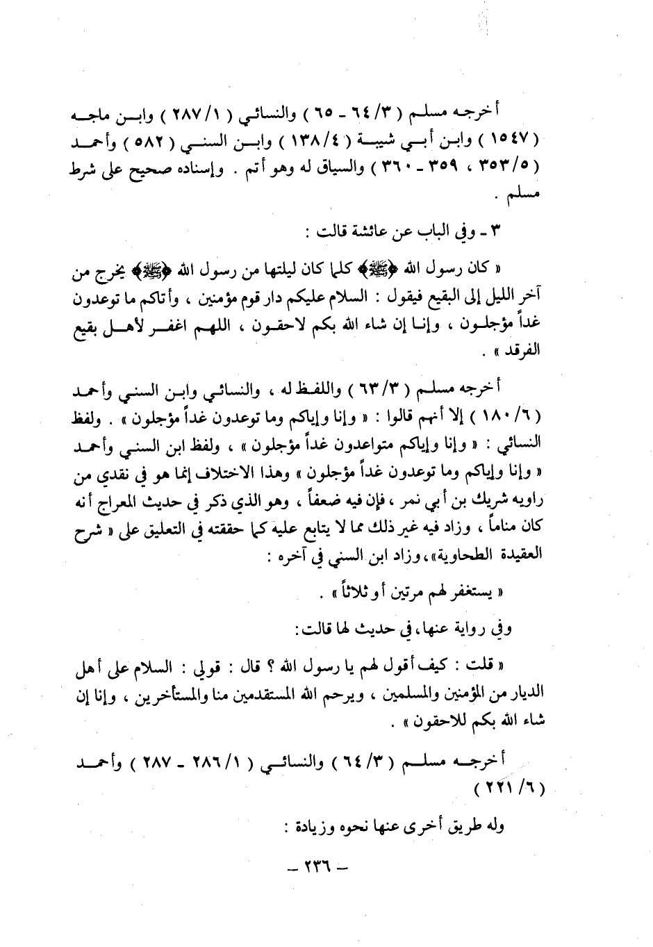 ولفظ النسائى: " وإنا وإياكم متواعدون غدا مؤجلون " , ولفظ ابن السنى وأحمد " وإنا وإياكم وما توعدون غداً مؤجلون " وهذا الاختلاف إنما هو فى نقدى من رواية شريك بن أبى نمر , فإن فيه ضعفاً , وهو الذى ذكر فى حديث المعراج أنه كان مناما , وزاد فيه غير ذلك مما لا يتابع عليه كما حققته فى التعليق على " شرح العقيدة الطحاوية " , وزاد ابن السنى فى آخره: " يستغفر لهم مرتين أو ثلاثا ".