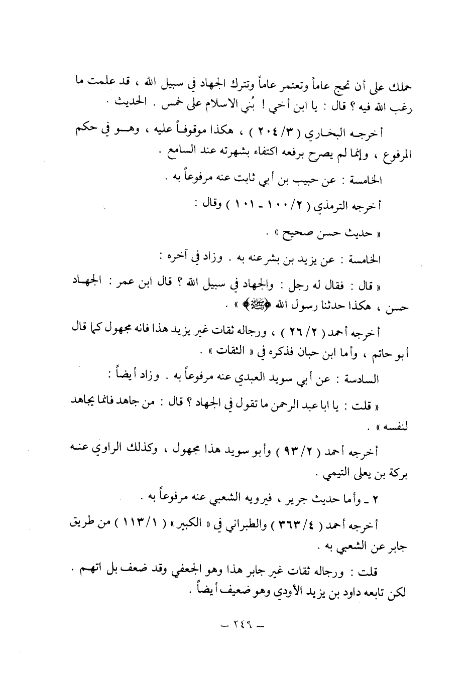 حملك على أن تحج عاما وتعتمر عاما وتترك الجهاد فى سبيل الله , قد علمت ما رغب الله فيه؟ قال: يا ابن أخى! بنى الإسلام على خمس. الحديث.