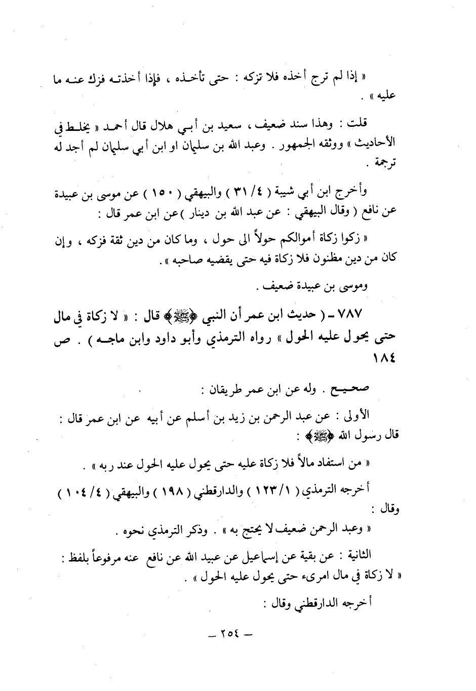 (787) - (حديث ابن عمر أن النبى صلى الله عليه وسلم قال: " لا زكاة فى مال حتى يحول عليه الحول " رواه الترمذى وأبو داود وابن ماجه (ص 184) .