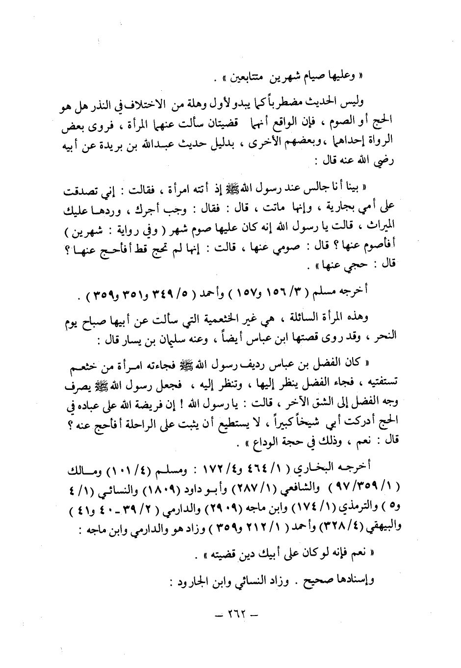 وليس الحديث مضطربا كما يبدو لأول وهلة من الاختلاف فى النذر هل هو الحج أو الصوم , فإن الواقع أنهما قضيتان سألت عنهما المرأة , فروى بعض الرواة إحداهما , وبعضهم الأخرى , بدليل حديث عبد الله بن بريدة عن أبيه رضى الله عنه قال: " بينا أنا جالس عند رسول الله صلى الله عليه وسلم إذ أتته امرأة , فقالت: إنى تصدقت على أمى بجارية , وإنها ماتت , قال: فقال: وجب أجرك , وردها عليك الميراث , قالت يا رسول الله إنه كان عليها صوم شهر (وفى رواية: شهرين) أفأصوم عنها؟ قال: صومى عنها , قالت: إنها لم تحج قط أفأحج عنها؟ قال: حجى عنها "