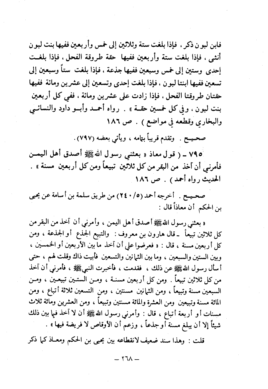 (795) - (قول معاذ: " بعثنى رسول الله صلى الله عليه وسلم أصدق أهل اليمن فأمرنى أن آخذ من البقر من كل ثلاثين تبيعا ومن كل أربعين مسنة " الحديث رواه أحمد (ص 186) .