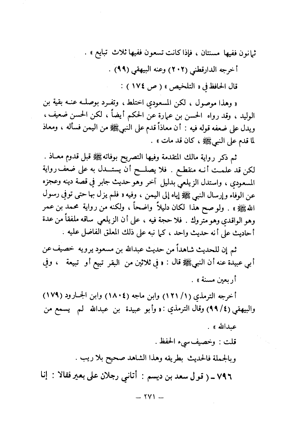 لكن قد علمت أنه منقطع. فلا يصلح أن يستدل به على ضعف رواية المسعودى , واستدل الزيلعى بدليل آخر وهو حديث جابر فى قصة دينه وعجزه عن الوفاء وإرسال النبى صلى الله عليه وسلم إياه إلى اليمن , وفيه " فلم يزل بها حتى توفى رسول الله صلى الله عليه وسلم ". ولو صح هذا لكان دليلاً واضحا , ولكنه من رواية محمد بن عمر وهو الواقدى وهو متروك. فلا حجة فيه , على أن الزيلعى ساقه ملفقا من عدة أحاديث على أنه حديث واحد , كما نبه على ذلك المعلق الفاضل عليه.