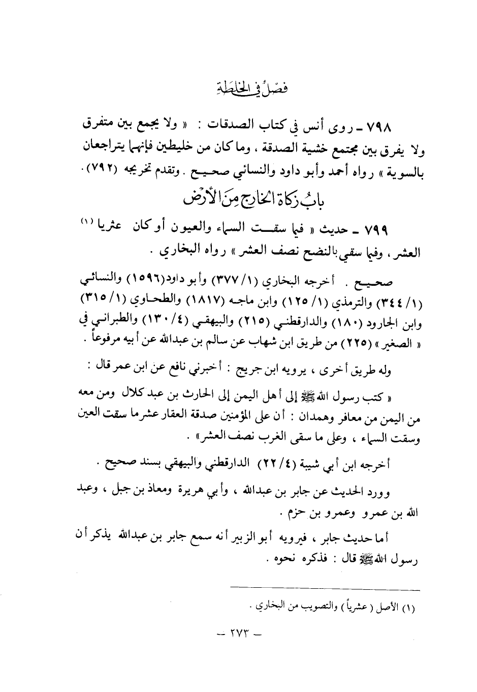 (799) - (حديث: " فيما سقت السماء والعيون أو كان عثريا (1) العشر , وفيما سقى بالنضح نصف العشر " رواه البخارى.