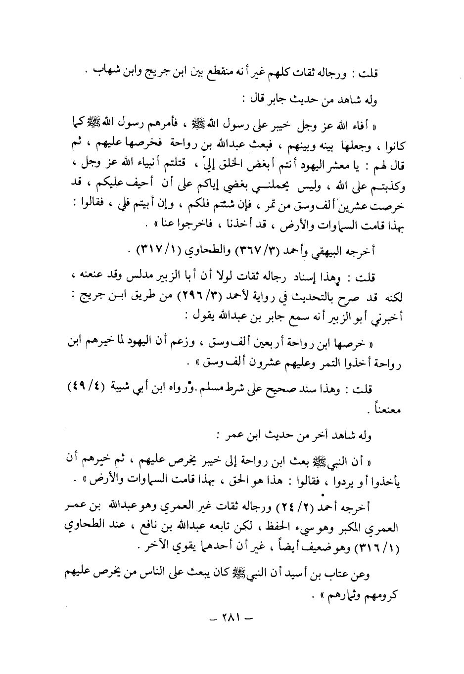قلت: وهذا إسناد رجاله ثقات لولا أن أبا الزبير مدلس وقد عنعنه , لكنه قد صرح بالتحديث فى رواية لأحمد (3/296) من طريق ابن جريج: أخبرنى أبو الزبير أنه سمع جابر بن عبد الله يقول: " خرصها ابن رواحة أربعين ألف وسق , وزعم أن اليهود لما خيرهم ابن رواحة أخذوا التمر وعليهم عشرون ألف وسق ".