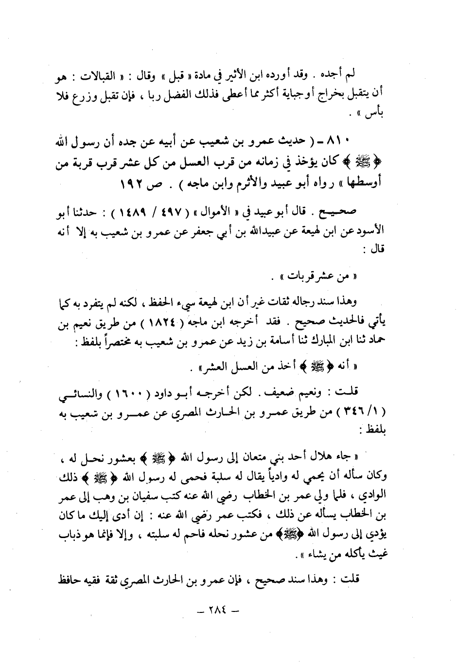 (810) - (حديث عمرو بن شعيب عن أبيه عن جده: " أن رسول الله صلى الله عليه وسلم كان يؤخذ فى زمانه من قرب العسل من كل عشر قرب قربة من أوسطها ". رواه أبو عبيد والأثرم وابن ماجه (ص 192) .