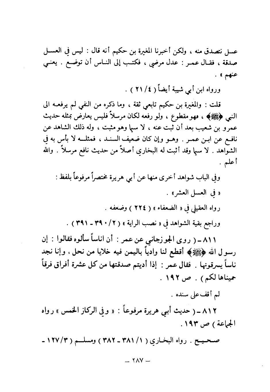 (811) - (روى الجوزجانى عن عمر: " أن أناسا سألوه فقالوا: إن رسول الله صلى الله عليه وسلم أقطع لنا واديا باليمن فيه خلايا من نحل , وإنا نجد ناسا يسرقونها. فقال عمر: إذا أديتم صدقتها من كل عشرة أفراق فرقا حميناها لكم " (ص 192) .