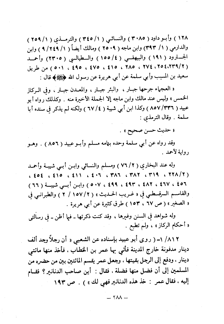 128) وأبو داود (3085) والنسائى (1/345) والترمذى (1/259) والدارمى (1/393) وابن ماجه (2509) ومالك أيضا (1/249/9) وابن الجارود (191) والبيهقى (4/155) والطيالسى (2305) وأحمد (2/239 , 254 , 274 , 285 , 415 , 475 , 495 , 501) من طريق سعيد بن المسيب وأبى سلمة عن أبى هريرة عن رسول الله صلى الله عليه وسلم قال: " العجماء جرحها جبار , والبئر جبار , والمعدن جبار , وفى الركاز الخمس " وليس عند مالك وابن ماجه إلا الجملة الأخيرة منه. وكذلك رواه أبو عبيد (336/857) وكذا ابن أبى شيبة (4/67) ولكنه لم يذكر فى سنده أبا سلمة وقال الترمذى: " حديث حسن صحيح ".