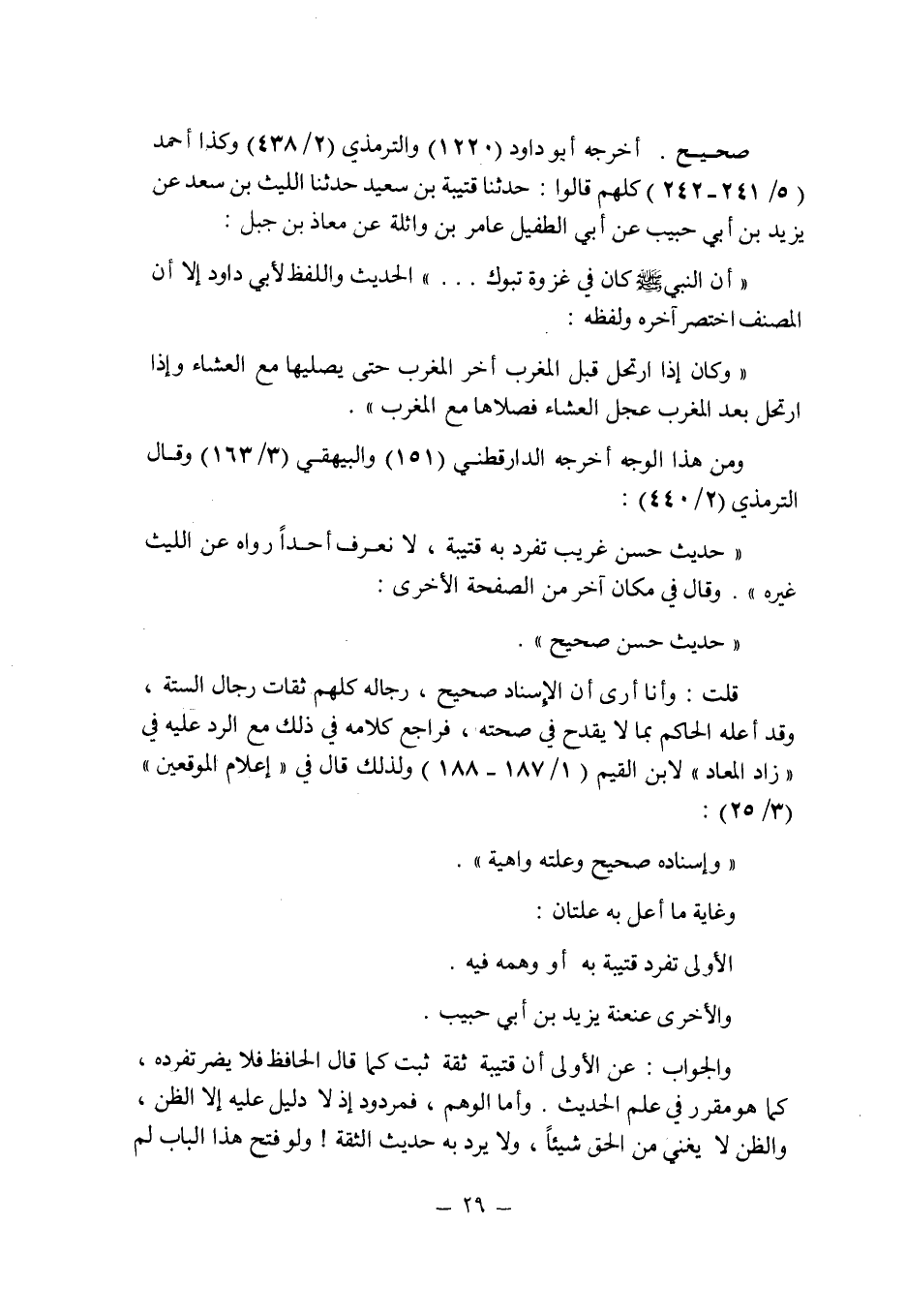 والجواب: عن الأولى أن قتيبة ثقة ثبت كما قال الحافظ فلا يضر تفرده , كما هو مقرر فى علم الحديث. وأما الوهم , فمردود إذ لا دليل عليه إلا الظن , والظن لا يغنى من الحق شيئا , ولا يرد به حديث الثقة! ولو فتح هذا الباب لم