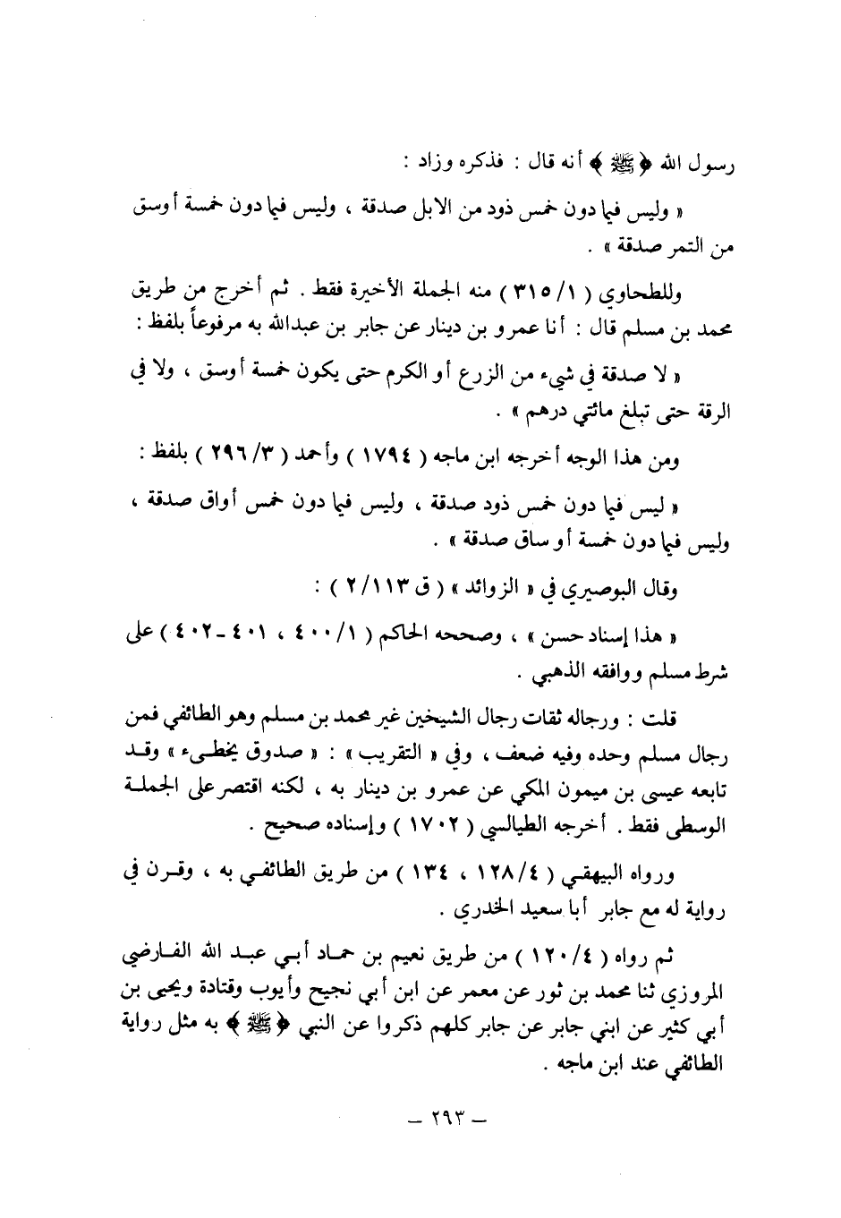 وللطحاوى (1/315) منه الجملة الأخيرة فقط. ثم أخرج من طريق محمد بن مسلم قال: أنبأنا عمرو بن دينار عن جابر بن عبد الله به مرفوعا بلفظ: " لا صدقة فى شىء من الزرع أو الكرم حتى يكون خمسة أوسق , ولا فى الرقة حتى تبلغ مائتى درهم ".