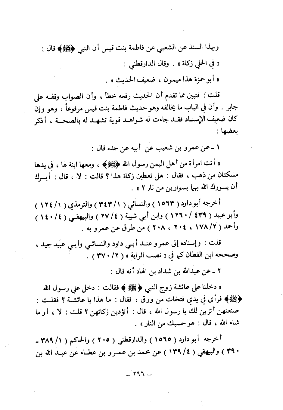 2 ـ عن عبد الله بن شداد بن الهاد أنه قال: " دخلنا على عائشة زوج النبى صلى الله عليه وسلم فقالت: دخل على رسول الله صلى الله عليه وسلم فرأى فى يدى فتخات من ورق , فقال: ما هذا يا عائشة؟ فقلت: صنعتهن أتزين لك يا رسول الله , قال: أتؤدين زكاتهن؟ قلت: لا , أو ما شاء الله , قال: هو حسبك من النار ".