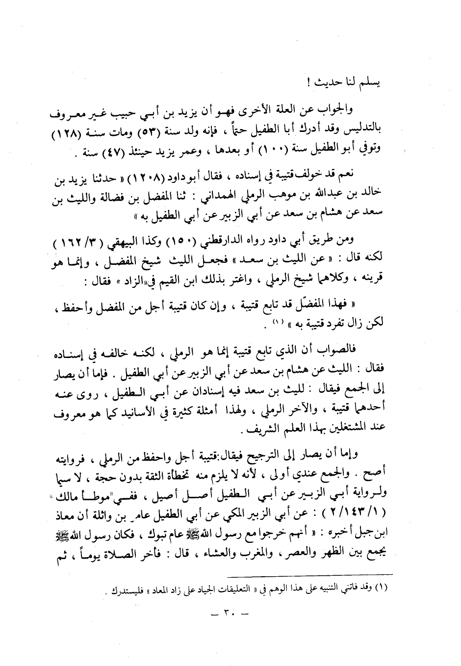 فالصواب أن الذى تابع قتيبة إنما هو الرملى , لكنه خالفه فى إسناده فقال: الليث عن هشام بن سعد عن أبى الزيبر عن أبى الطفيل. فإما أن يصار إلى الجمع فيقال: لليث بن سعد فيه إسنادان عن أبى الطفيل , روى عنه أحدهما قتيبة , والآخر الرملى , ولهذا أمثلة كثيرة فى الأسانيد كما هو معروف عند المشتغلين بهذا العلم الشريف.