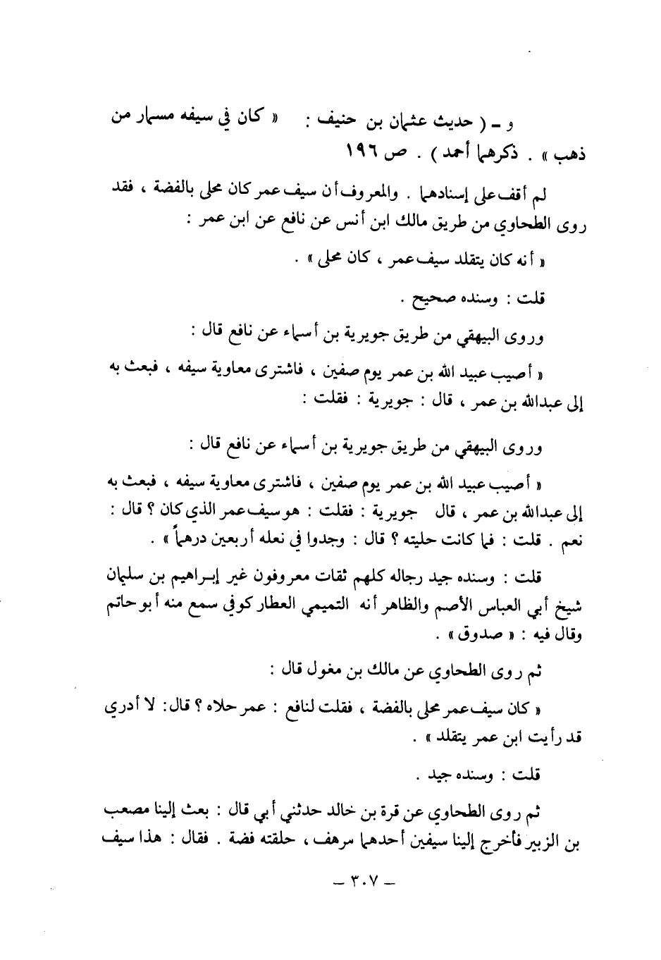 ثم روى الطحاوى عن مالك بن مغول قال: " كان سيف عمر محلى بالفضة , فقلت لنافع: عمر حلاه؟ قال: لا أدرى قد رأيت ابن عمر يتقلد ".