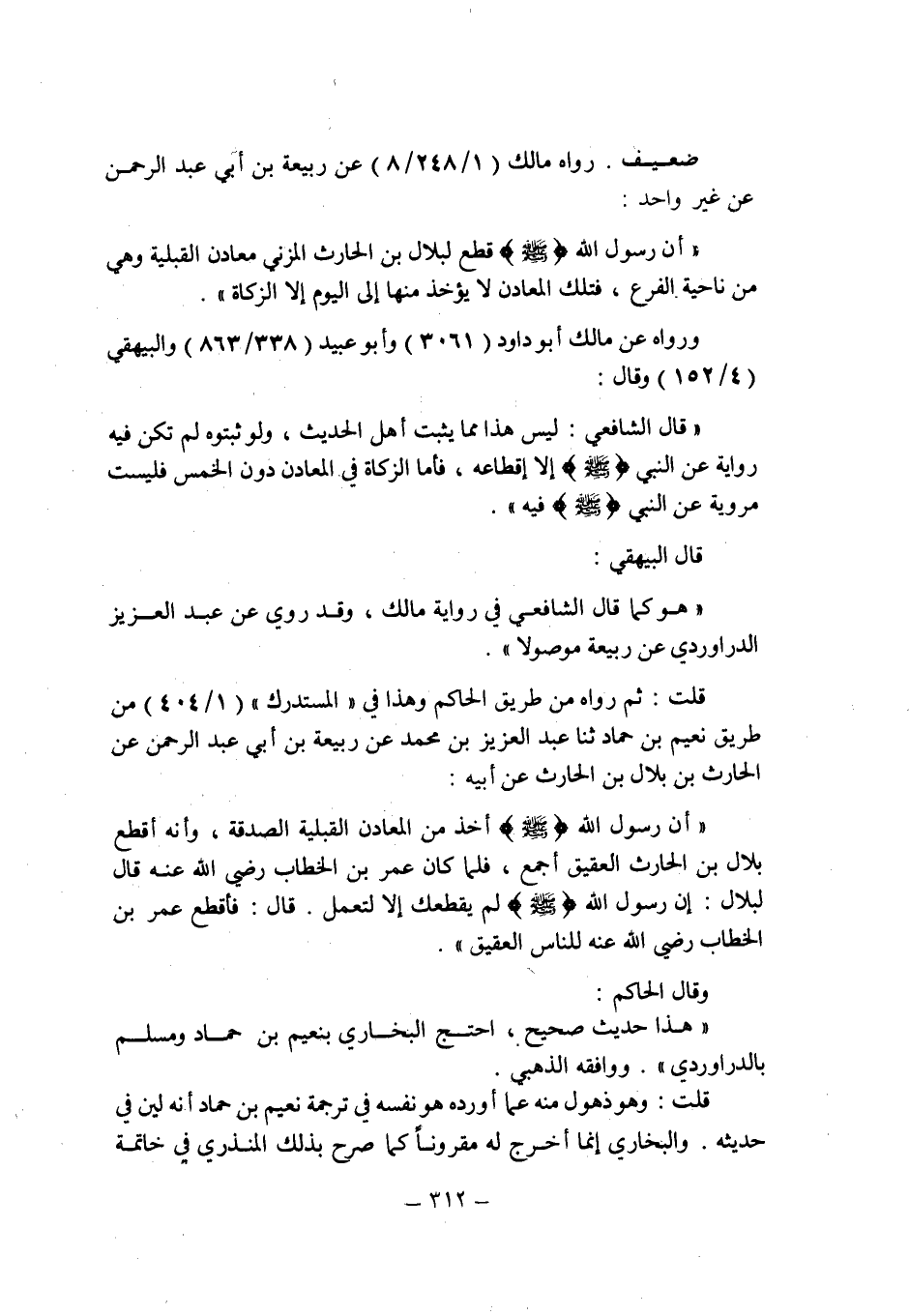 ورواه عن مالك: أبو داود (3061) وأبو عبيد (338/863) والبيهقى (4/152) وقال: " قال الشافعى: ليس هذا مما يثبت أهل الحديث , ولو ثبتوه لم تكن فيه رواية عن النبى صلى الله عليه وسلم إلا إقطاعه , فأما الزكاة فى المعادن دون الخمس فليست مرويه عن النبى صلى الله عليه وسلم فيه ".