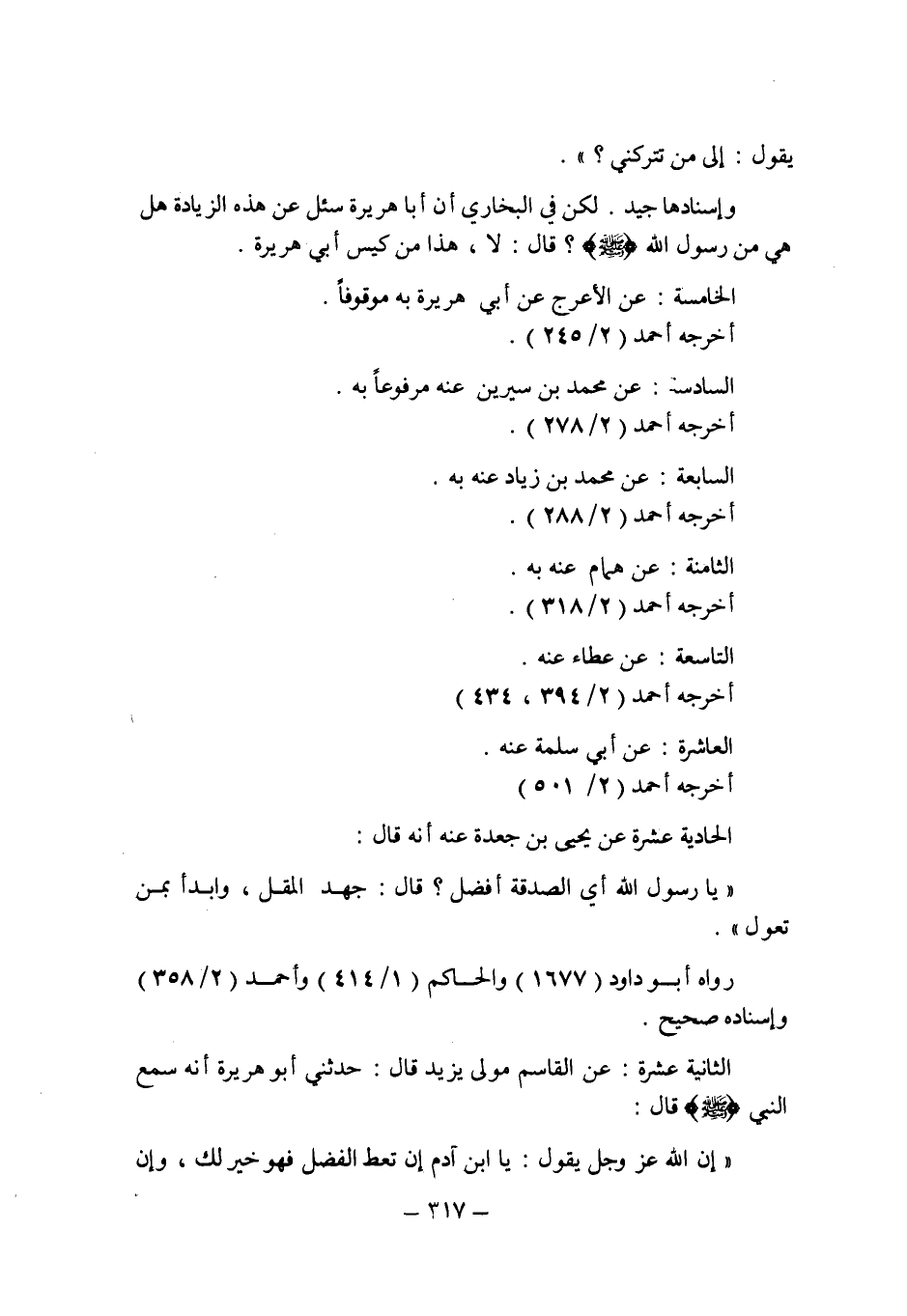 الثانية عشرة: عن القاسم مولى يزيد قال: حدثنى أبو هريرة أنه سمع النبى صلى الله عليه وسلم قال: " إن الله عز وجل يقول: يا ابن آدم إن تعط الفضل فهو خير لك , وإن