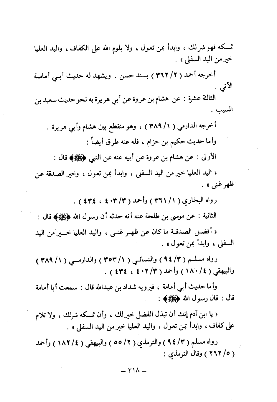 وأما حديث حكيم بن حزام , فله عنه طرق أيضا: الأولى: عن هشام بن عروة عن أبيه عنه عن النبى صلى الله عليه وسلم قال: " اليد العليا خير من اليد السفلى , وابدأ بمن تعول , وخير الصدقة عن ظهر غنى ".