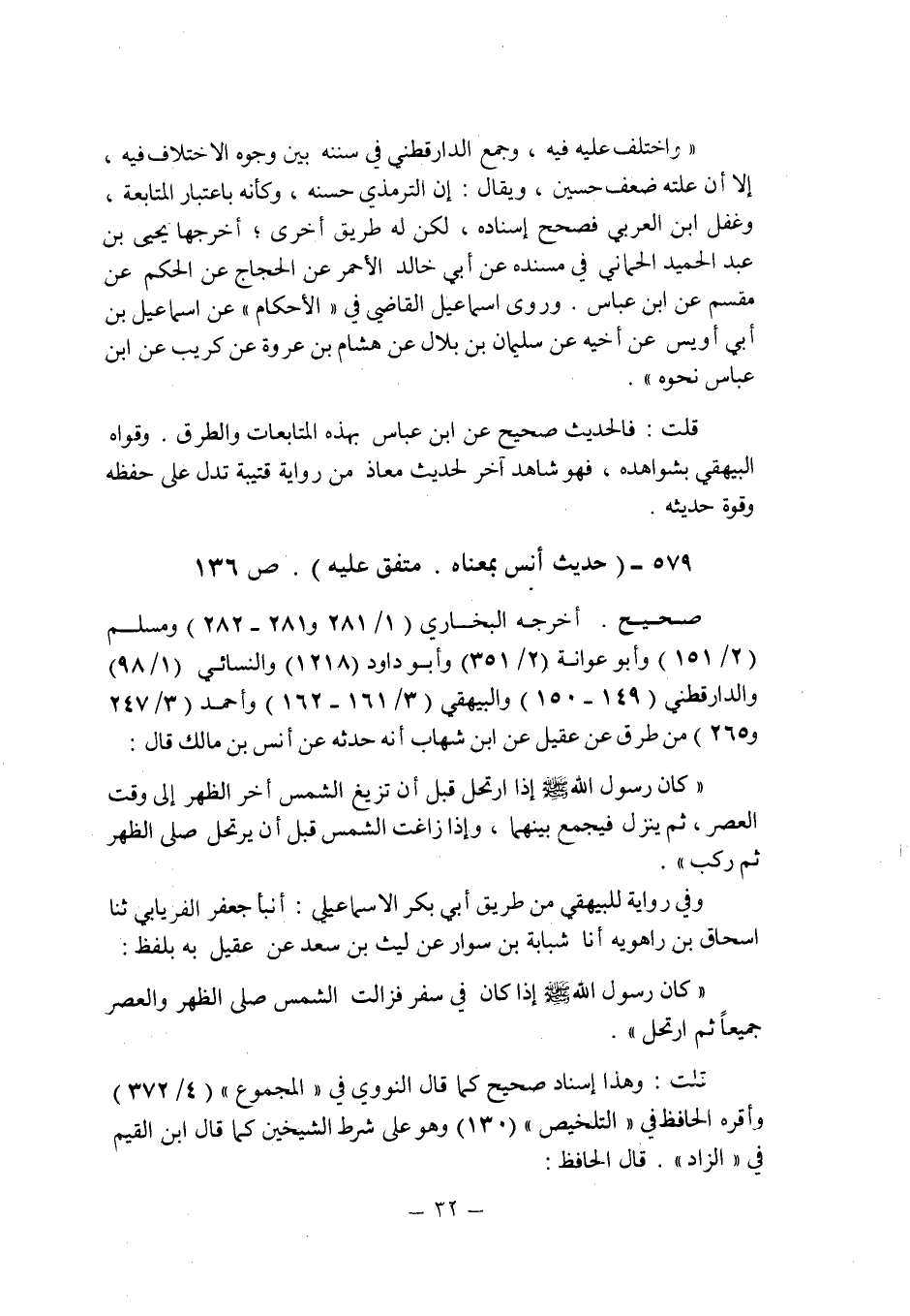 أخرجه البخارى (1/281 و281 ـ 282) ومسلم (2/151) وأبو عوانة (2/351) وأبو داود (1218) والنسائى (1/98) والدارقطنى (149 ـ 150) والبيهقى (3/161 ـ 162) وأحمد (3/247 و265) من طرق عن عقيل عن ابن شهاب أنه حدثه عن أنس بن مالك قال: " كان رسول الله صلى الله عليه وسلم إذا ارتحل قبل أن تزيغ الشمس أخر الظهر إلى وقت العصر , ثم ينزل فيجمع بينهما , وإذا زاغت الشمس قبل أن يرتحل صلى الظهر ثم ركب ".