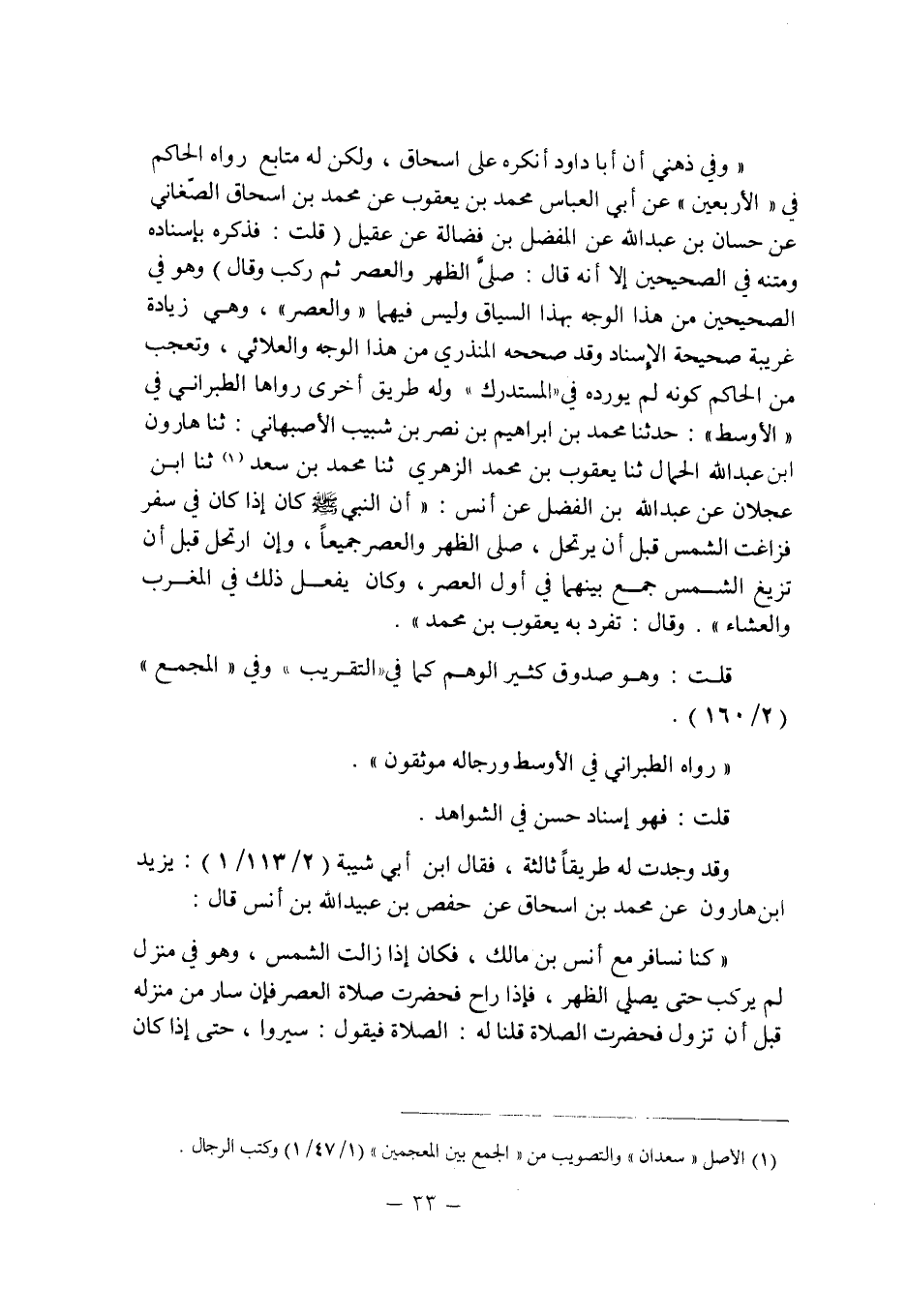 وقد وجدت له طريقاً ثالثة , فقال ابن أبى شيبة (2/113/1) : يزيد بن هارون عن محمد بن إسحاق عن حفص بن عبيد الله بن أنس قال: " كنا نسافر مع أنس بن مالك , فكان إذا زالت الشمس , وهو فى منزل لم يركب حتى يصلى الظهر , فإذا راح فحضرت صلاة العصر فإن سار من منزله قبل أن تزول فحضرت الصلاة قلنا له: الصلاة فيقول: سيروا , حتى إذا كان