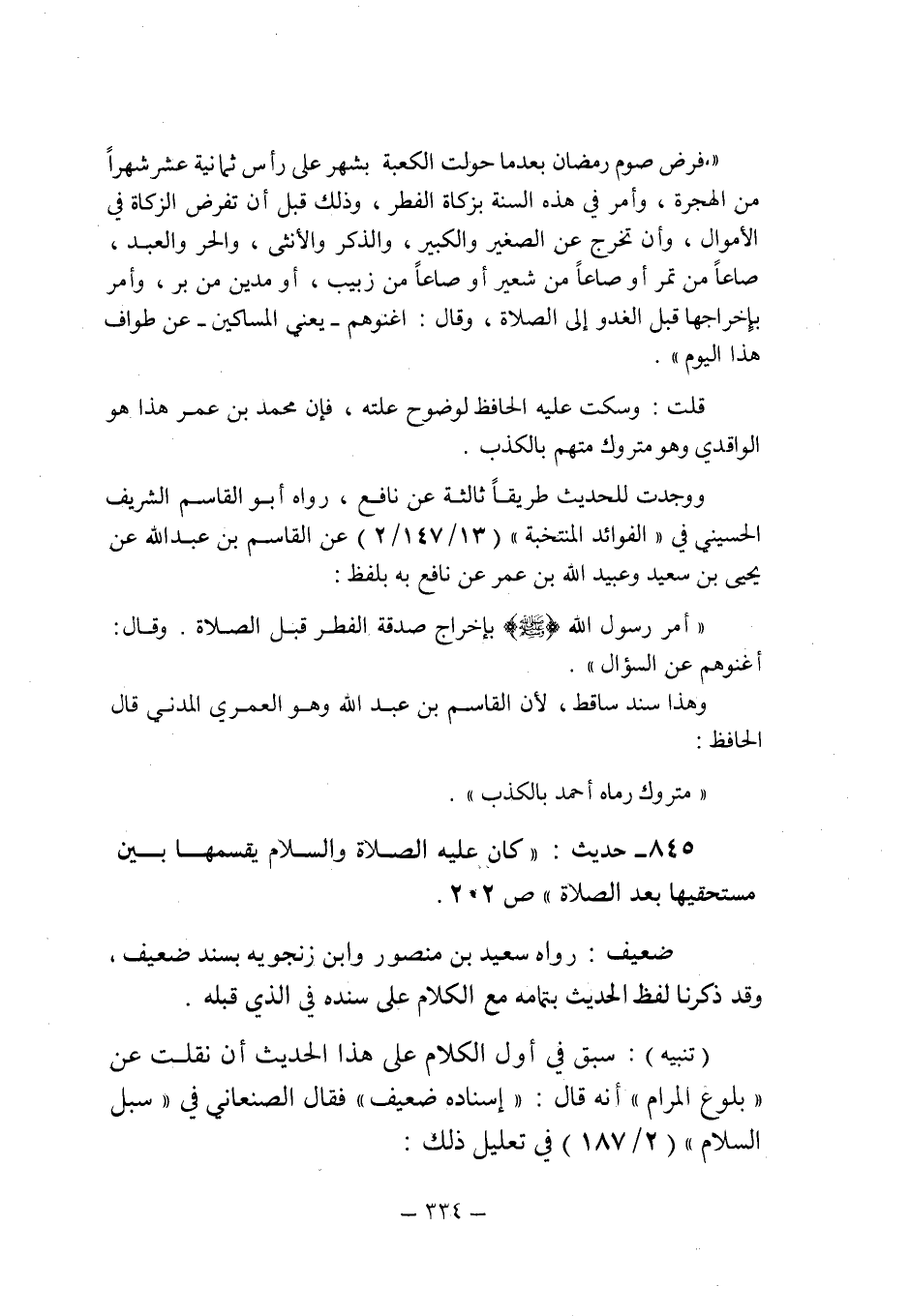 ووجدت للحديث طريقا ثالثة عن نافع , رواه أبو القاسم الشريف الحسينى فى " الفوائد المنتخبة " (13/147/2) عن القاسم بن عبد الله عن يحيى بن سعيد وعبيد الله بن عمر عن نافع به بلفظ: " أمر رسول الله صلى الله عليه وسلم بإخراج صدقة الفطر قبل الصلاة. وقال: أغنوهم عن السؤال ".