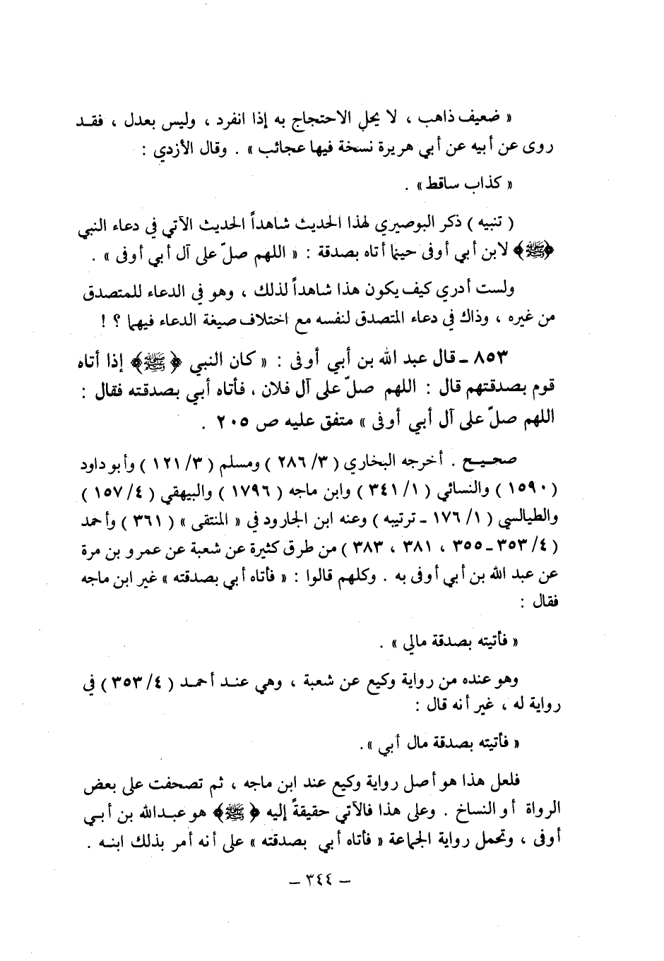(853) - (قال عبد الله بن أبى أوفى: " كان النبى صلى الله عليه وسلم إذا أتاه قوم بصدقتهم قال: اللهم صلّعلى آل فلان , فأتاه أبى بصدقته فقال: اللهم صلِّ على آل أبى أوفى " متفق عليه (ص 205) .