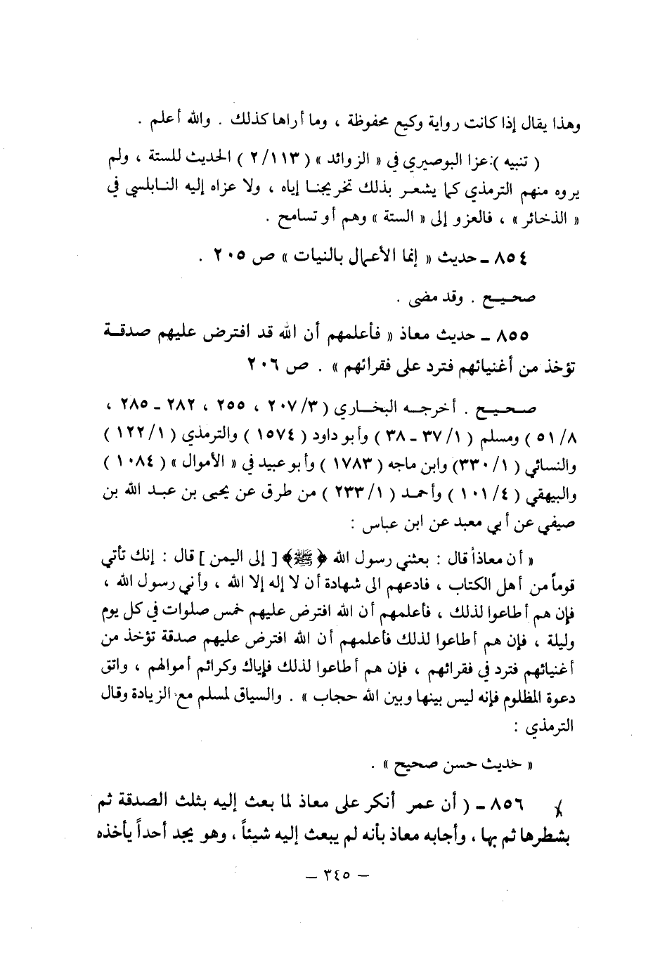 (855) - (حديث معاذ: " فأعلمهم أن الله قد افترض عليهم صدقة تؤخذ من أغنيائهم فترد على فقرائهم " (ص 206) .