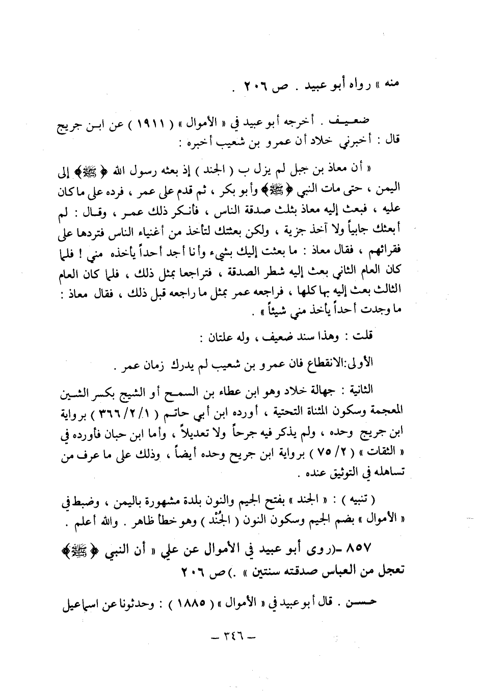 أخرجه أبو عبيد فى " الأموال " (1911) عن ابن جريج قال: أخبرنى خلاد أن عمرو ابن شعيب أخبره: " أن معاذ بن جبل لم يزل ب (الجند) إذ بعثه رسول الله صلى الله عليه وسلم إلى اليمن , حتى مات النبى صلى الله عليه وسلم وأبو بكر , ثم قدم على عمر , فرده على ما كان عليه , فبعث إليه معاذ بثلث صدقة الناس , فأنكر ذلك عمر , وقال: لم أبعثك جابيا ولا آخذ جزية , ولكن بعثتك لتأخذ من أغنياء الناس فتردها على فقرائهم , فقال معاذ: ما بعثت إليك بشىء وأنا أجد أحدا يأخذه منى! فلما كان العام الثانى بعث إليه شطر الصدقة , فتراجعا بمثل ذلك , فلما كان العام الثالث بعث إليه بها كلها , فراجعه عمر بمثل ما راجعه قبل ذلك , فقال معاذ: ما وجدت أحدا يأخذ منى شيئا ".