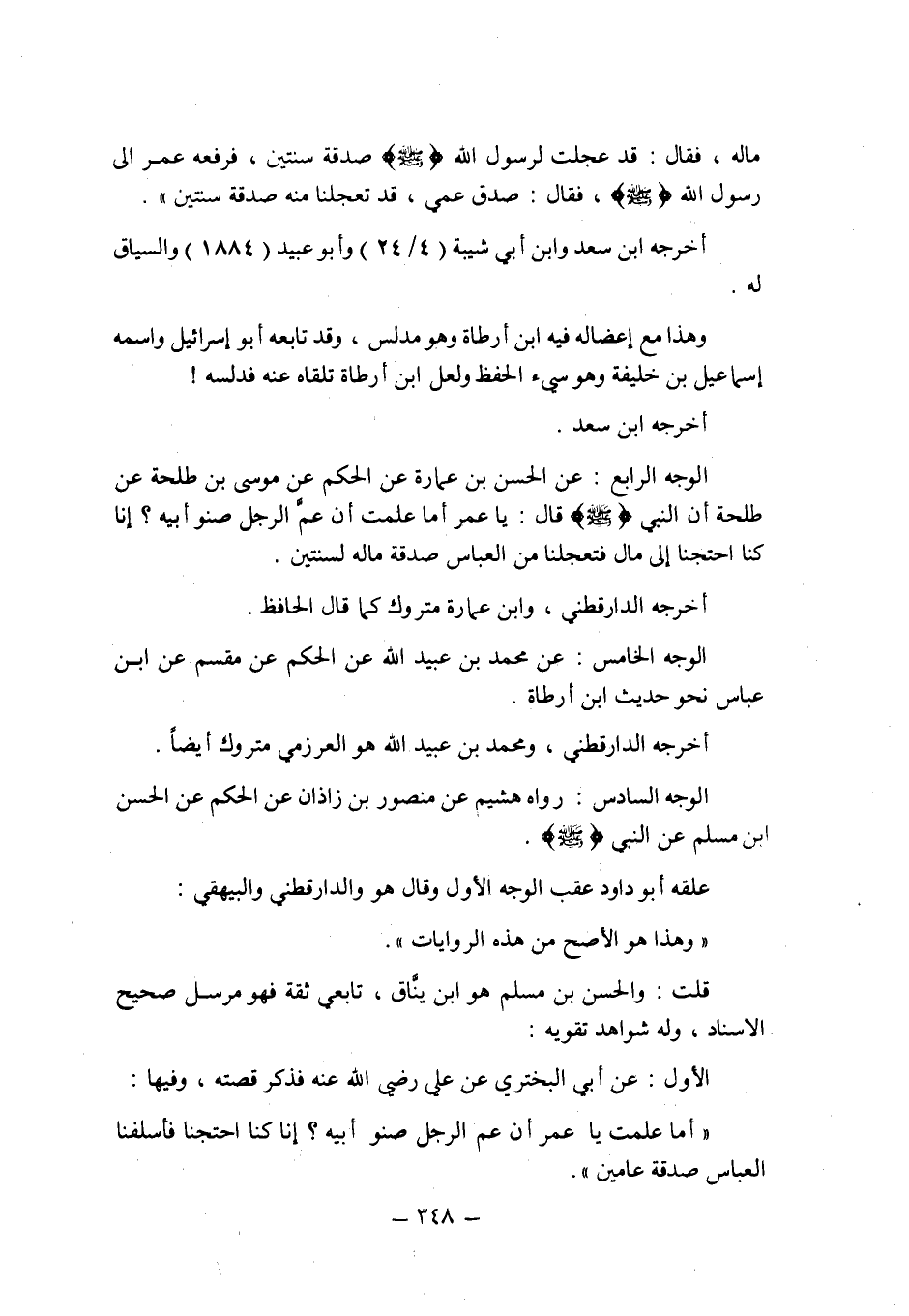 الوجه الرابع: عن الحسن بن عمارة عن الحكم عن موسى بن طلحة عن طلحة أن النبى صلى الله عليه وسلم قال: " يا عمر أما علمت أن عم الرجل صنو أبيه؟ إنا كنا احتجنا إلى مال فتعجلنا من العباس صدقة ماله لسنتين ".