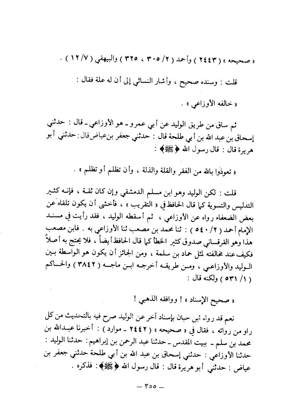 قلت: لكن الوليد وهو ابن مسلم الدمشقى وإن كان ثقة , فإنه كثير التدليس والتسوية كما قال الحافظ فى " التقريب " , فأخشى أن يكون تلقاه عن بعض الضعفاء رواه عن الأوزاعى , ثم أسقطه الوليد , فقد رأيت فى مسند الإمام أحمد (2/540) : حدثنا محمد بن مصعب حدثنا الأوزاعى به. فابن مصعب هذا وهو القرقسانى صدوق كثير الخطأ كما قال الحافظ أيضا , فلا يحتج به أصلاً فكيف عند