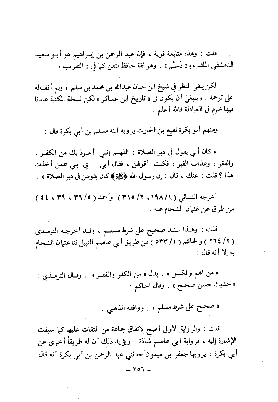 ومنهم أبو بكرة نفيع بن الحارث يرويه ابنه مسلم بن أبى بكرة قال: " كان أبى يقول فى دبر الصلاة: اللهم إنى أعوذ بك من الكفر , والفقر , وعذاب القبر , فكنت أقولهن , فقال أبى: أى بنى عن من أخذت هذا؟ قلت: عنك , قال: إن رسول الله صلى الله عليه وسلم كان يقولهن فى دبر الصلاة ".