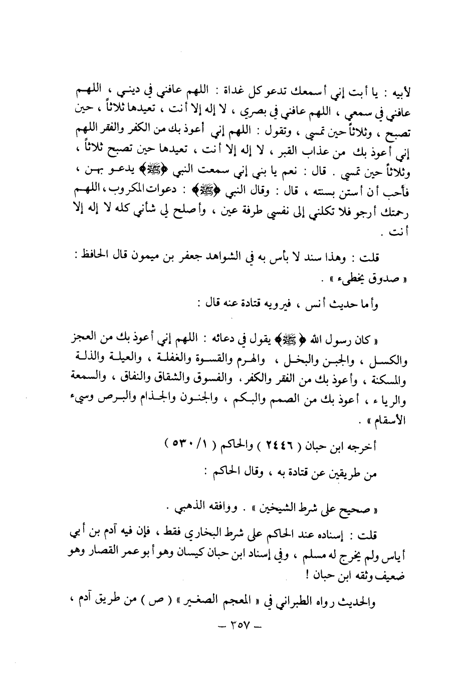 لأبيه: يا أبت إنى أسمعك تدعو كل غداة: اللهم عافنى فى دينى , اللهم عافنى فى سمعى , اللهم عافنى فى بصرى , لا إله إلا أنت , تعيدها ثلاثا , حين تصبح , وثلاثا حين تمسى , وتقول: اللهم إنى إعوذ بك من الكفر والفقر اللهم إنى أعوذ بك من عذاب القبر , لا إله إلا أنت , تعيدها حين تصبح ثلاثا , وثلاثا حين تمسى. قال: نعم يا بنى إنى سمعت النبى صلى الله عليه وسلم يدعو بهن , فأحب أن أستن بسنته , قال: وقال النبى صلى الله عليه وسلم: دعوات المكروب , اللهم رحمتك أرجو فلا تكلنى إلى نفسى طرفة عين , وأصلح لى شأنى كله لا إله إلا أنت.