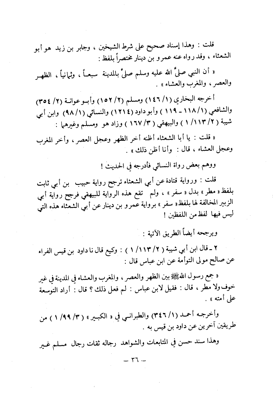قلت: ورواية قتادة عن أبي الشعثاء ترجح رواية حبيب بن أبي ثابت بلفظ مطر بدل سفر، ولم تقع هذه الرواية للبيهقي فرجح رواية أبي الزبير المخالفة لها بلفظ سفر برواية عمرو بن دينار عن أبي الشعثاء هذه التي ليس فيها لفظ من اللفظين!